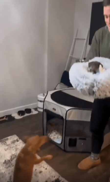 주인이 조심스럽게 방석을 내려놓습니다. 그 위에는 작은 새끼 강아지가 포근하게 자리 잡고 있습니다. 아무것도 모르는 듯 평온한 표정으로 앉아 있는 새끼 강아지. 하지만 이 모습을 본 한 마리가 이미 흥분 상태에 돌입했습니다.