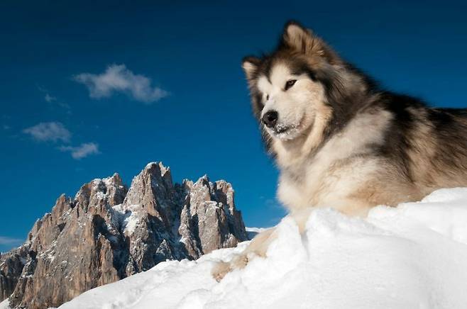 알래스칸 말라뮤트는 몸무게가 평균 35~40kg 정도 나가는 대형견이에요. 말흘레뭇(Mahlemut)이라는 알래스카의 이누이트 부족 이름에서 따와 ‘알래스칸 말라뮤트’라는 이름을 갖게 되었어요.