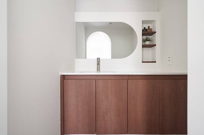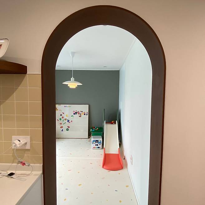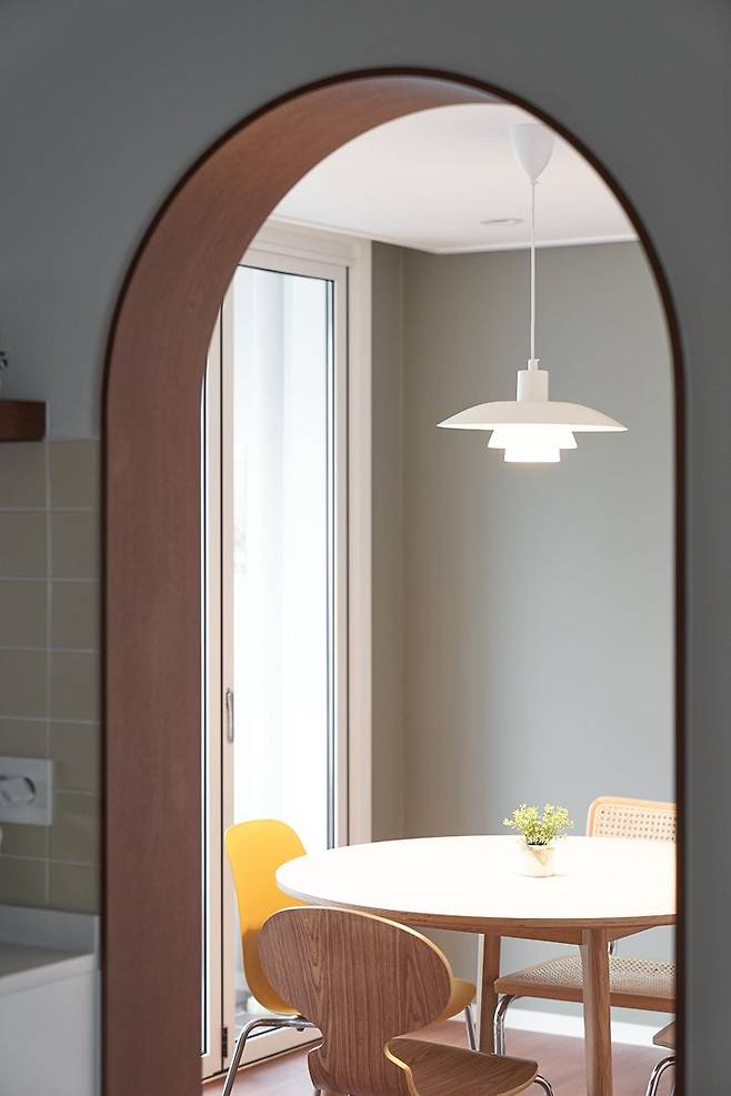원래 주방 바로 옆에 있는 방은 다이닝룸으로 꾸미려고 했습니다. 그래서 이동할 때 불편하지 않도록 문은 없애고 다른 방과 차별을 두기 위해 아치형 문으로 만들었습니다.