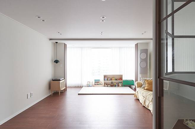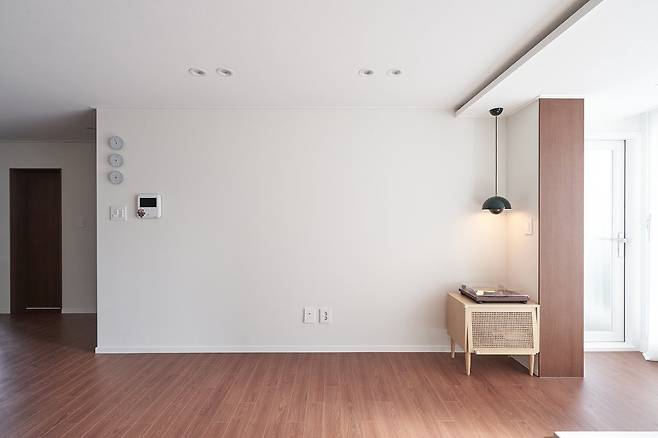 확장 시공을 할 때 옹벽이라 철거하지 못한 베란다 벽에는 마룻바닥과 연장이 되는 색의 필름을 입혀 통일성을 주고 거실 확장부가 액자처럼 보이도록 디자인하였습니다.