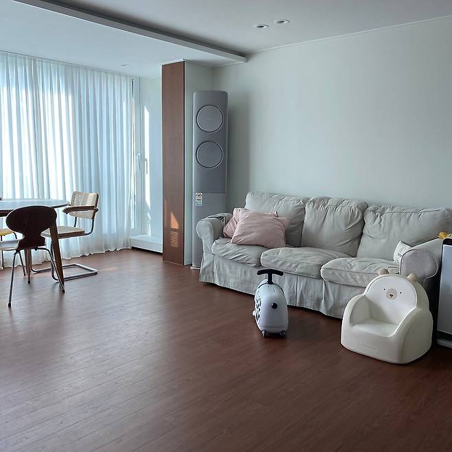 거실은 가족이 함께 시간을 보내는 공간이면서 저를 위한 공간이 되어 주기도 하는 곳이에요. 사진은 맨 처음 이사 왔을 때의 모습인데요. 아이가 많이 어려 거실에 거의 둔 게 없었습니다. 이제 막 기어 다니기 시작한 아이가 부딪히거나 다칠 염려가 있어 의도치 않게 미니멀리즘 컨셉으로 거실을 꾸몄었습니다. 커다란 매트를 깔아두고 주변에 아무것도 없이 텅 비워뒀던 기억이 나네요.