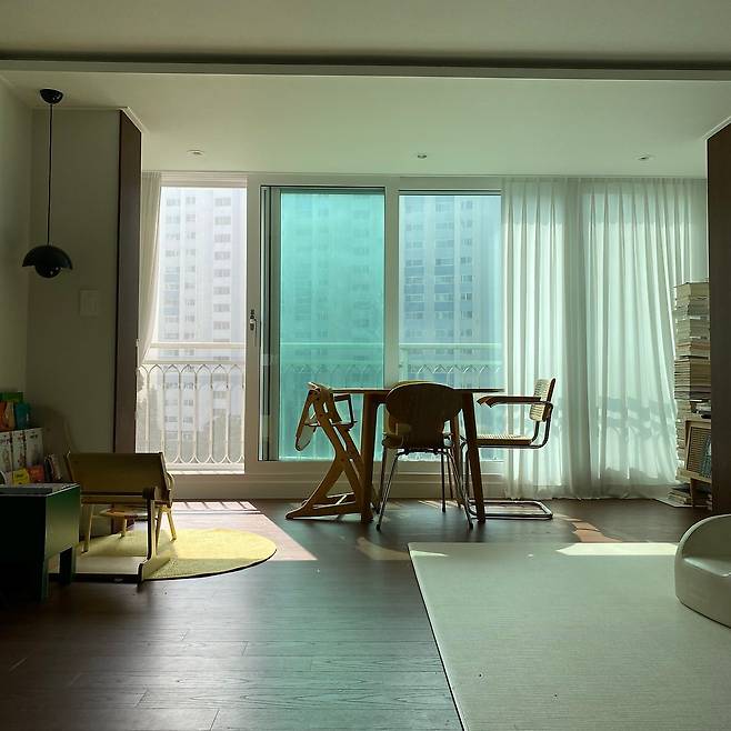 그런데 최근엔 조금 달라졌어요. 다이닝룸에서 쫓겨난 식탁이 확장 시공을 한 베란다 확장부에 자리를 잡게 되어, 거실에서 따뜻하고 맛있는 식사도 하고 아이와 재미난 책을 읽게 되었거든요.