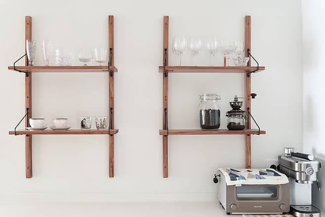 주방의 여유 공간엔 사진처럼 홈카페를 꾸몄습니다. 벽에 선반을 설치하여 커피 관련 용품과 커피잔 등을 올려두었어요.