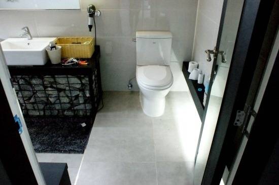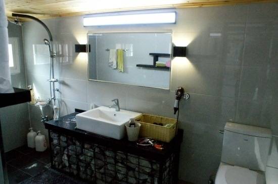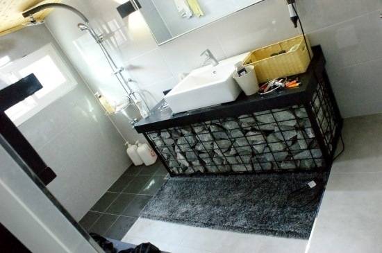 화장실 하부장은 담장만들다 남은 메쉬로 용접해서 락카칠하고 만들었습니다. 그레이 느낌으로 고급스럽게 만들고 싶었는데, 그레이 타일은 포세린밖에 없다고 해서 값싼 일반 벽타일로 했는데 그게 조금 아쉽네요.