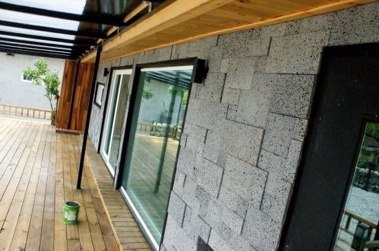 외벽은 드라이비트마감에 전면까지 드라이비트들어가면 삭막해보일까봐 전면에는 드라이비트위에 인터넷으로 화산석타일 구매해서 압착으로 붙였습니다