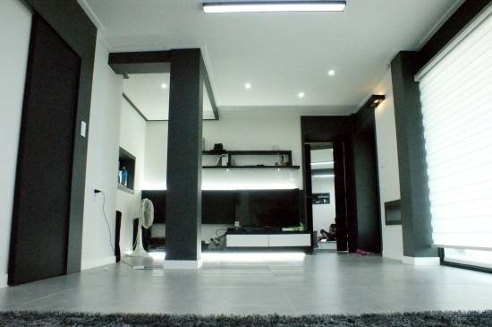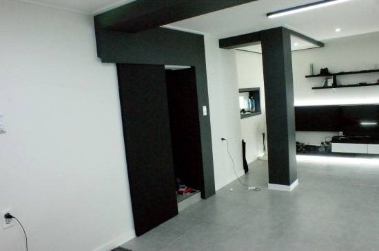 간접등을 좋아해서 좁은 방이라도 느낌나게 포인트 줄 곳곳에 간접등을 만들어넣었습니다. 마감은 신한 실크화이트벽지에 블랙래핑으로 마감했습니다.