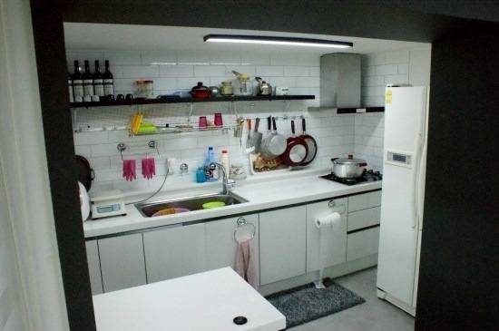 싱크대 비용도 줄이고 보기도 깔끔하라고 상부장은 달지 않았습니다. 주방과 화장실 집기들도 인터넷으로 구매했습니다. 식탁은 씽크대 하면서 같이 만들었구요. 스툴은 옥션에서 하나 만구천원 하는걸로 3개 구입했습니다. 렌지후드도 인터넷 최저가 검색에서 30만원에 구매했습니다.