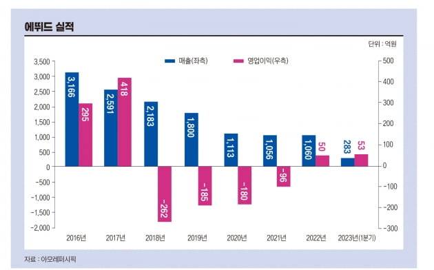 결국 에뛰드는 2018년 적자로 돌아섰고 2020년에는 자본 잠식에 빠졌다. 2016년 3166억원이었던 매출은 지난해 1060억원까지 떨어졌다. 2017년 418억원에 달했던 영업이익은 1년 후인 2018년 262억원 적자로 돌아섰다. 2020년과 2021년에도 각각 180억원, 96억원의 적자를 내며 4년간 적자를 기록했다.