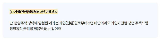 가입(전환)일로부터 2년 이상 유지해야 합니다. 단, 국민주택규모 이하 당첨계좌 등은 가입(전환)일로부터 2년 미만이어도 비과세 혜택을 받을 수 있어요.