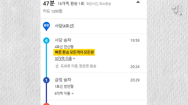 진짜인지 직접 가보니 정말 1호선 금정역과 4호선 금정역은 성인 보폭으로 7~8걸음이면 오갈 수 있었다. 문이 열리고 약간 빠른 걸음으로 가니 환승이 정말 3초밖에 걸리지 않았는데. 어디서 내려야 가장 환승이 빠른지 알려주는 지하철 어플에 금정역을 검색하니, ‘모든 객차, 모든 문’으로 나와 있다.