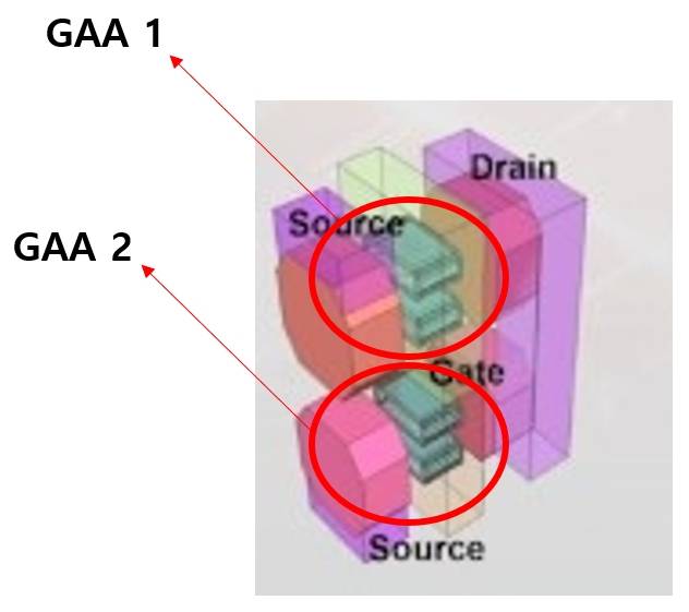 여기서 잠깐. 삼성전자가 얼마 전 발표한 게이트올어라운드(GAA) 개념과는 어떻게 다른 건지 궁금해하실 분도 있으실텐데요. GAA는 n 또는 p 반도체, 그러니까 개별 소자를 만들 때 활용되는 구조입니다. GAA는 전압을 거는 게이트와 전류가 흐르는 통로인 채널이 닿는 면을 늘려서 데이터 처리 속도를 늘린다는 콘셉트인데요. 삼성전자는 이번 3나노 공정에서 반도체 인버터의 n반도체에 GAA를 적용한 것으로 알려져 있습니다.