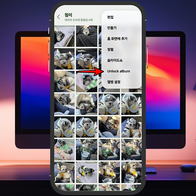 2) '더보기(⋮)' → 'Unlock album' 클릭