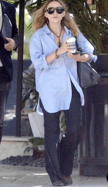 그리고 메리 케이트 올슨.오버핏 셔츠에 블랙 팬츠, 선글라스, 그리고 역시 메쉬 슈즈.톤온톤 룩에 은근한 텍스처 포인트를 더하며 고급스러움을 살렸다.