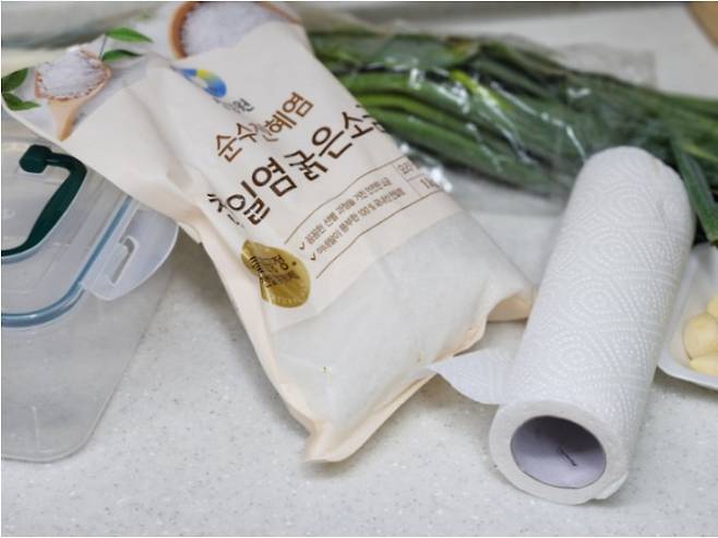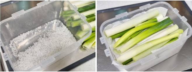 이렇게 해두면 소금이 수분을 흡수해 대파가 무르지 않아요.