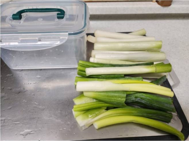 먼저, 대파는 밑동을 자르고 줄기 부분을 보관통 길이에 맞춰 잘라주세요. 그래야 보관할 때 깔끔하고 사용하기도 편하답니다.