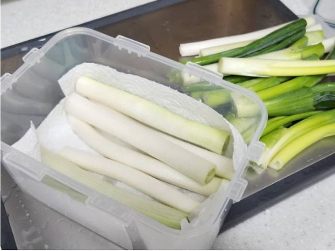 그 위에 키친타월을 한 겹 올리고 물기를 잘 닦은 대파를 차곡차곡 넣어주세요.