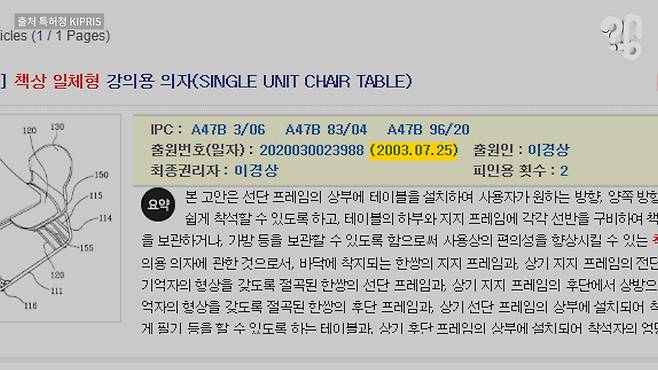 특허청에 일체형 책상 관련 자료를 찾아보니, ‘책상 일체형 강의용 의자’라는 명으로 2003년에 등록된 자료를 찾아볼 수 있었다. 발명자는 ‘이경상’. 그래서 이경상 대표가 근무한다는 대우가구에 전화했는데, 이미 오래전 은퇴하셨다고 한다. 어렵게 연락처를 구해 어쩌다가 일체형 책상을 개발하시게 되었는지 여쭤봤다.