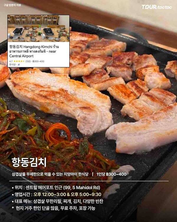 치앙마이 공항 근처에 위치한 항동김치는 삼겹살 무한리필을 대표 메뉴로 내세우는 치앙마이 한식당입니다. 김치, 찌개, 곰탕, 돈가스 등 다양한 메뉴를 점심과 저녁에만 제공하며, 현지에 사는 한국인 가족 단골이 많습니다.