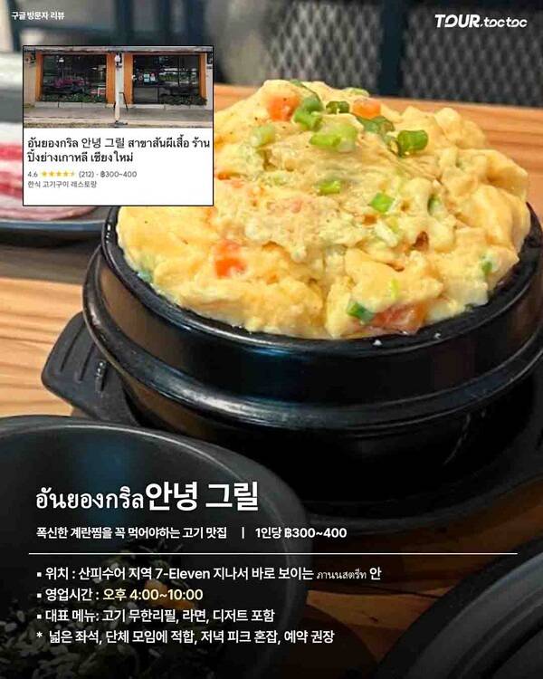 산피수어 지역 파논 스트리트에 있는 안녕 그릴은 고기 무한리필과 함께 라면, 디저트까지 포함된 구성을 제공합니다. 단체 모임에도 적합한 넓은 좌석을 갖추고 있으며 현지 태국인과 한국인 모두에게 인기가 높습니다. 저녁 피크 타임에는 대기 인원이 많아 예약을 추천합니다.