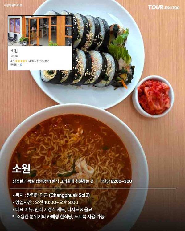 싼티탐 인근 창푸악 소이 2에 위치한 소원은 카페와 한식당을 결합한 독특한 공간입니다. 한식 가정식 세트와 디저트, 음료를 동시에 즐길 수 있어 치앙마이 한달살이 중인 프리랜서나 유학생들에게 인기가 높습니다. 조용한 분위기 덕분에 식사와 노트북 작업을 병행하기 좋은 치앙마이 맛집입니다.