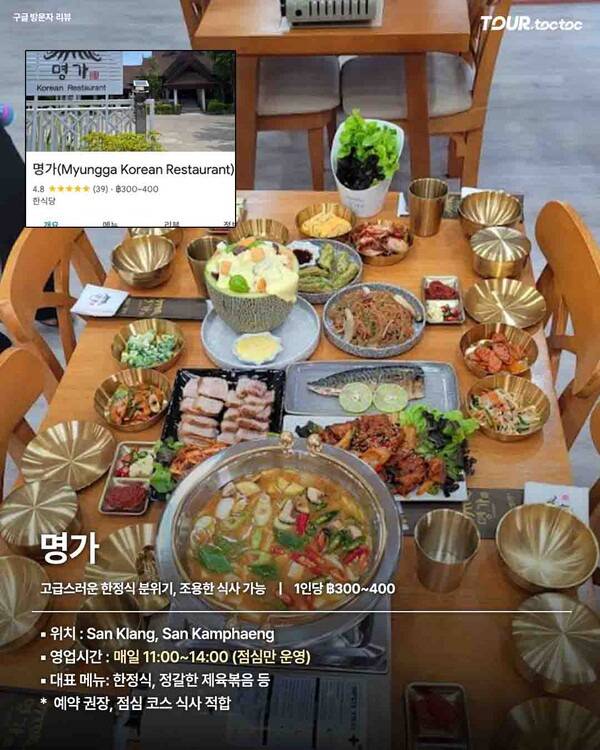 산캄팽 지역에 자리한 명가는 점심에만 문을 여는 한정식 전문점입니다. 제육볶음을 포함한 다양한 메뉴를 정갈하게 차려내며, 고급스럽고 조용한 분위기로 가족 모임이나 특별한 식사 자리에 적합합니다. 치앙마이에서 정통 한정식을 경험하고 싶다면 명가를 선택해 보세요.