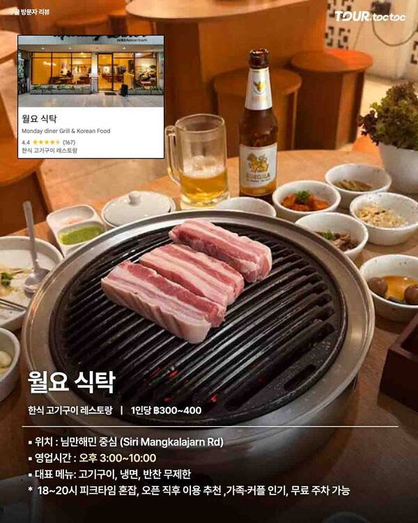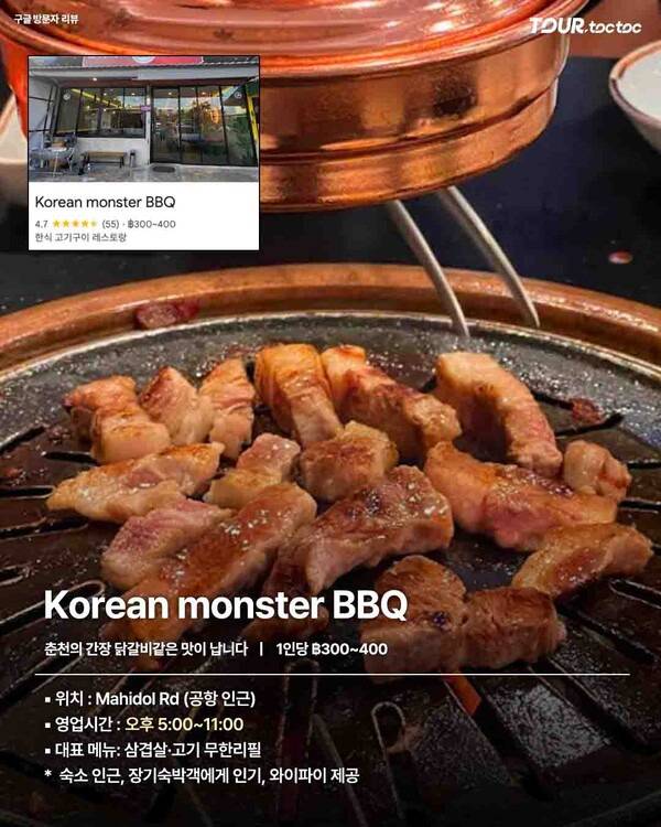 공항 인근 마히돌 로드에 위치한 코리안 몬스터 BBQ는 저녁에만 문을 여는 고기 무한리필 전문점입니다. 삼겹살을 비롯한 다양한 부위를 직접 구워 먹을 수 있으며, 어린이 동반 가족이나 친구 모임에 알맞습니다. 치앙마이 한달살기 중 고기가 그리운 날 찾기 좋은 치앙마이 맛집입니다.