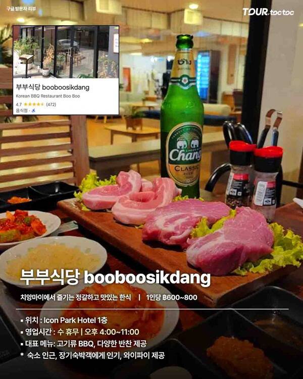 아이콘 파크 호텔 1층에 위치한 부부식당은 신선한 고기와 다양한 반찬, 한국식 주류까지 즐길 수 있는 치앙마이 한식당입니다. 숙소 인근 접근성이 좋아 찾기 편리하며, 와이파이와 주차 시설도 잘 갖추어져 있어 장기 숙박객과 여행자 모두에게 사랑받는 곳입니다.