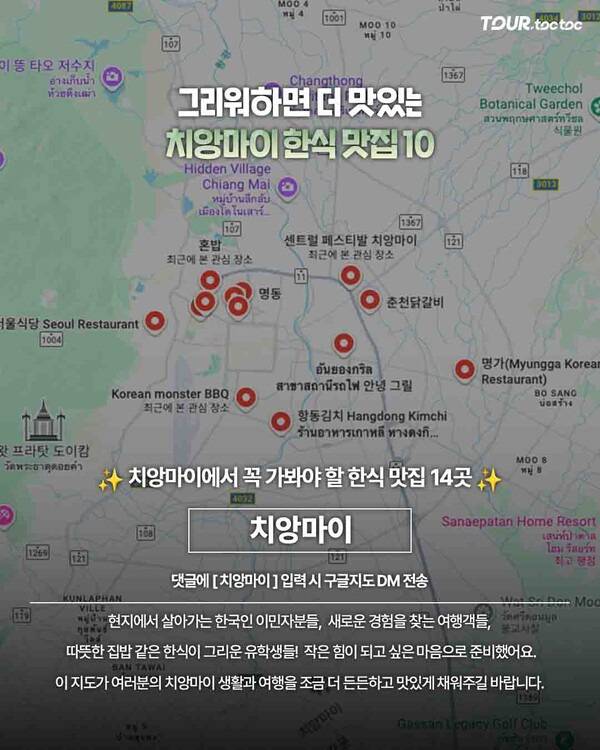 그런데 현지 음식만 먹다 보면 자연스레 한국의 집밥이나 따뜻한 국물이 그리워지죠. 이런 분들을 위해 직접 발로 뛰며 모은 치앙마이 한식당 추천 14곳을 소개합니다.