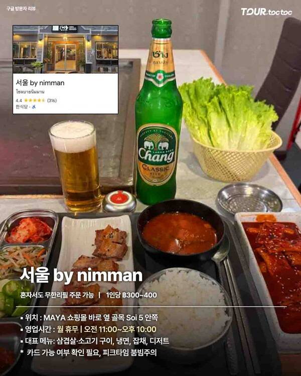 님만 소이 5, MAYA 쇼핑몰 옆 골목에 자리한 서울 바이 님만은 세련된 분위기에서 삼겹살과 소고기 구이, 잡채, 냉면 등을 즐길 수 있는 레스토랑입니다.