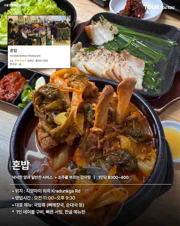 치앙마이 외곽 크라둥까 로드에 위치한 혼밥 레스토랑은 이름처럼 혼자서도 편안하게 식사할 수 있는 공간입니다. 뼈해장국, 순대국, 돼지국밥 등 국밥류가 대표 메뉴이며, 1인용 테이블과 한글 메뉴판이 준비되어 있습니다.
