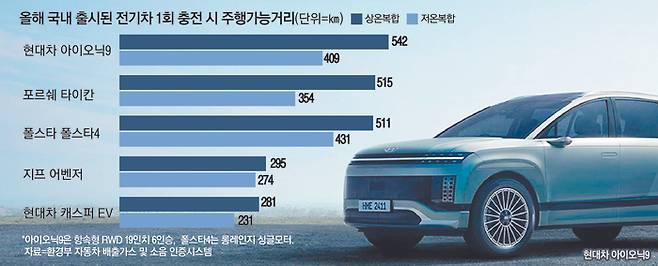 올해 출시된 차량 중 1회 충전 시 주행가능거리가 500㎞를 넘는 것은 총 5종으로 현대자동차 아이오닉9, 포르쉐 타이칸, 폴스타 폴스타4, 기아 EV3와 EV6다. 지난해에는 테슬라 모델S, 메르세데스-벤츠 EQS 450+, 기아 EV9 3종이 500㎞가 넘는 주행거리를 인증한 바 있다. 2022년에는 테슬라 모델 S AWD 1개 차종만이 해당 기준을 충족했다.