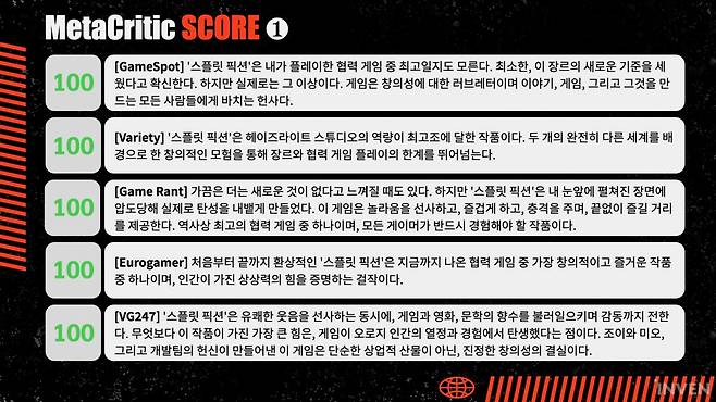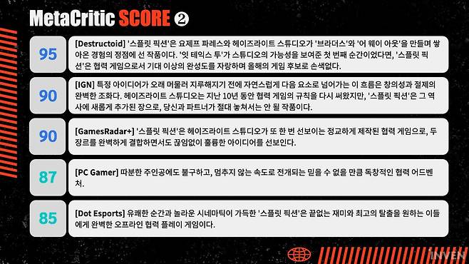 그럼에도 흔히 한 화면을 공유하며 같은 장소에 함께 게임하는 걸 의미하는 '소파 협동(Couch Co-op)'의 재미가 매우 뛰어나다는 평이 많았습니다. 현재 '스플릿 픽션'의 메타크리틱 점수는 91점, 오픈크리틱 점수는 90점으로 더 게임 어워드 올해의 게임이었던 '잇 테익스 투'보다 높은 점수입니다.