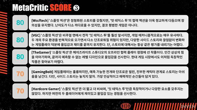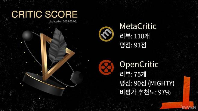 [CRITIC SCORE] 코너는 글로벌 신작의 주요 매체 평가를 요약해 정리해보는 코너입니다. 평점 기준 상위, 하위 총 15개 매체의 크리틱 점수와 요약 설명을 정리해 보다 쉽고, 빠르게 게임에 대한 시장의 의견과 시선을 살펴보길 원하는 게이머 여러분을 돕고자 합니다.