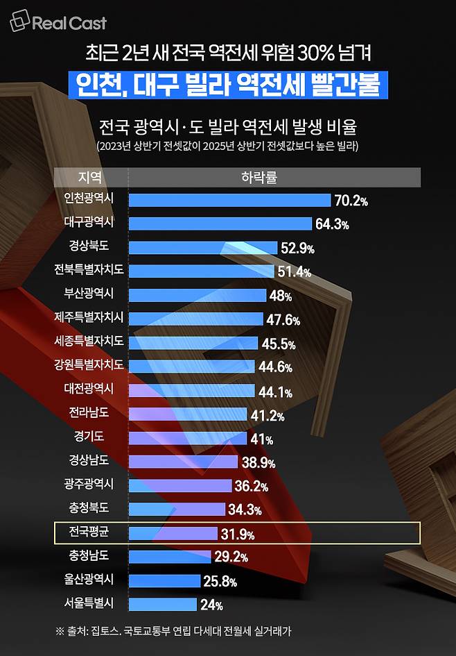 집토스에 따르면 2023년 상반기 대비 2025년 상반기 동일 면적 연립·다세대 전세 거래를 기준으로 전세 보증금이 하락한 거래 비율은 전국 평균 31.9%로 집계됐습니다.