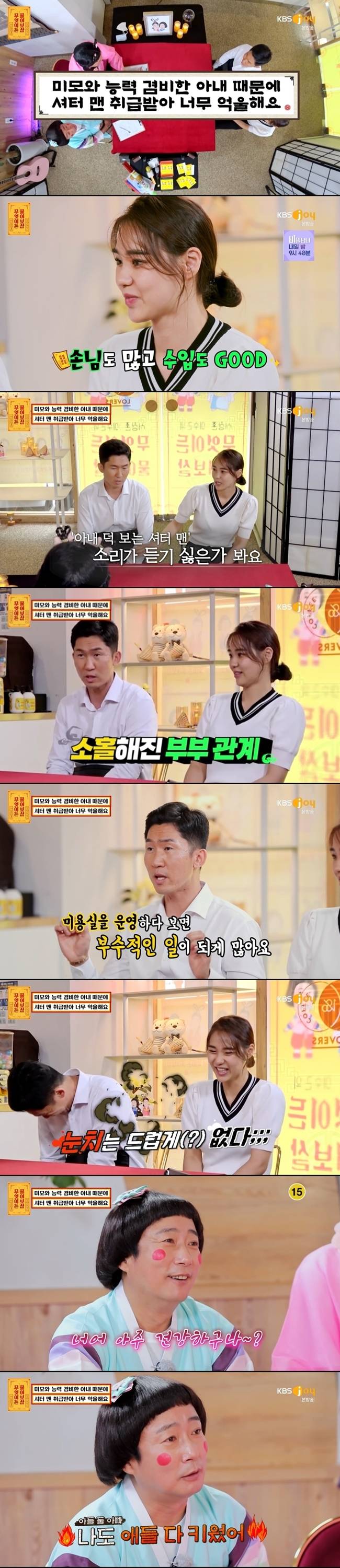 남편은 "아내랑 미용실을 함께 운영하는데 아내는 예쁘고 기술이 좋아서 수입이 높다. 그 밑그림을 그려준 건 저다. 손님들이 저한테 '셔터맨이다' '전생에 나라를 구하지 않았냐'라는 소리를 많이 듣는다. 힘들게 살았는데 억울한 소리를 많이 듣는다"고 고민을 밝혔다.
