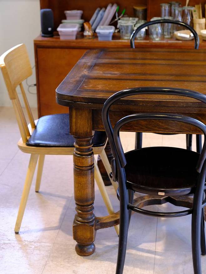 원래 이곳은 튀김만두 공장이었어요. 공사할 부분이 많긴 했는데, 탄소배출량을 줄이기 위해 너무 욕심 부리지 않기로 했죠. 테이블과 의자는 대부분 황학동 벼룩시장이나 빈티지숍에서 구매했고요. 제품 진열장 자체를 인테리어적인 요소로 보이고자 신경 썼어요. 탄소 배출을 최소화하면서 협소한 공간을 효율적으로 사용할 수 있는 가장 좋은 방법이니까요. 전시장과 나란히 놓인 창문이 저희 매장의 포인트예요. 창밖으로 은행나무와 교회가 어우러지는 풍경이 이국적인 분위기를 자아내거든요.