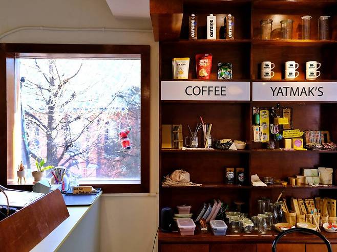 퇴사를 하고 난 후, 오프라인 숍에 도전해보고 싶었어요. 온라인 숍은 제로 웨이스트 제품을 소개하는 데 상대적으로 한계가 있더라고요. 제가 더 피커에서 경험한 것처럼 라이프스타일을 자연스럽게 알리고 싶었달까요. 우연한 기회에 이 자리를 알게 됐고 제로 웨이스트 숍으로는 월세 내기도 벅찰 것 같아 카페도 함께 열었죠. (웃음)