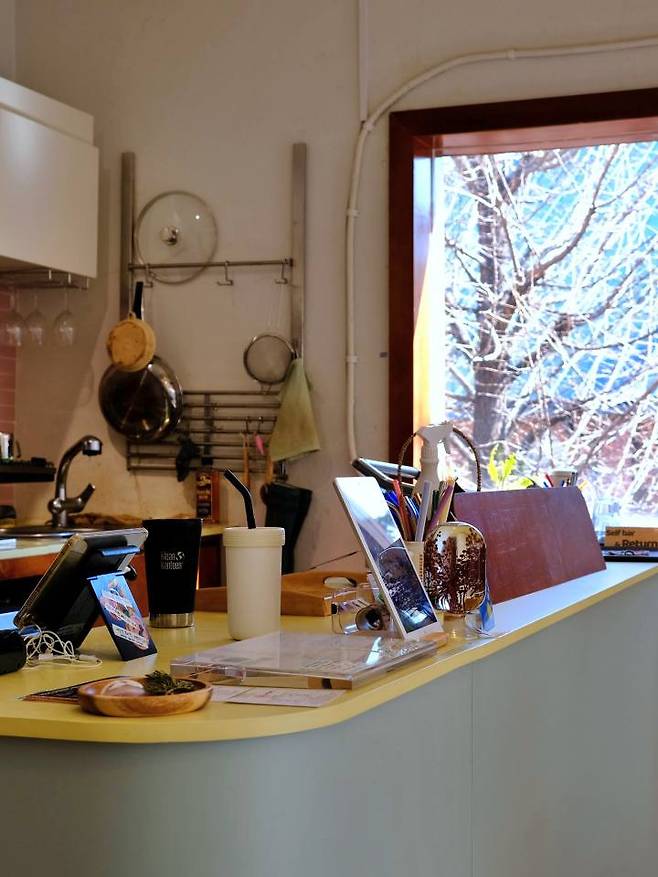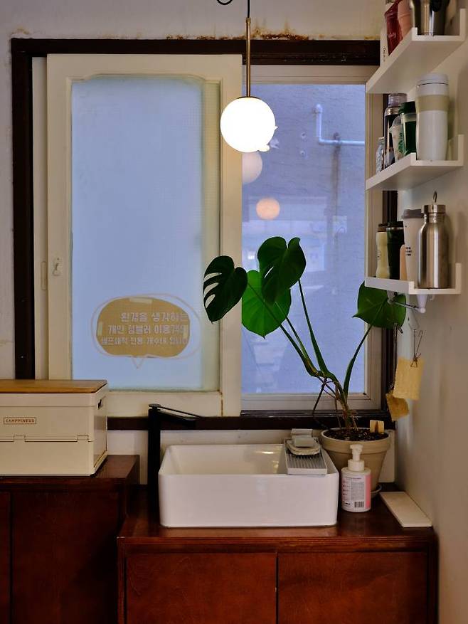 텀블러 유저라면 모두 공감할 거예요. 다회용기를 갖고 다니는 게 정말 쉬운 일이 아니잖아요. 눈치 보지 않고 세척할 수 있는 존을 꼭 따로 만들고 싶었어요. 또 테이크아웃하는 손님에게 기부 받은 텀블러를 무료로 대여해주기도 해요. 일회용기가 없는 제로 웨이스트 매장의 원칙이기도 하지만, 다회용기를 사용해보는 경험도 중요하다고 생각하거든요.