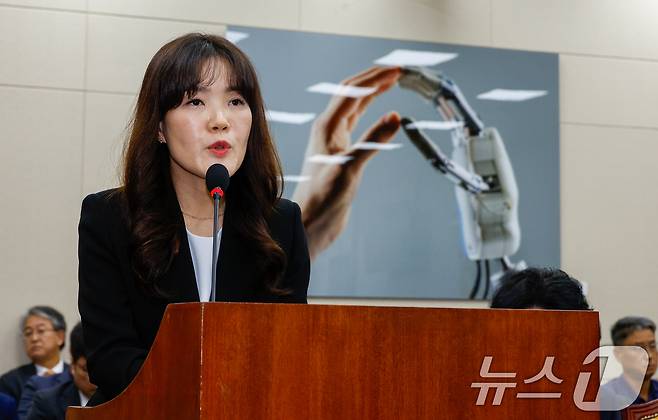 (서울=뉴스1) 안은나 기자 = 김수향 네이버 뉴스서비스 총괄전무가 7일 오후 서울 여의도 국회 과학기술정보방송통신위원회에서 열린 방송통신위원회·방송통신사무소·시청자미디어재단·한국방송광고진흥공사 국정감사에 출석해 최형두 국민의힘 간사 질의에 답하고 있다. 2024.10.7/뉴스1