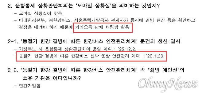 | ▲ 서울시는 동절기 기상상황에 따른 한강버스 운항을 의논·결정하는 모바일 상황실이 "카카오톡 단체 채팅방을 활용한다"고 밝혔다(상단 빨간색 네모). 또한 '동절기 한강 결빙에 따른 한강버스 선박 운항 안전관리계획'은 2026년 1월 20일에 만들어졌다고 설명했다(하단 빨간색 네모). |