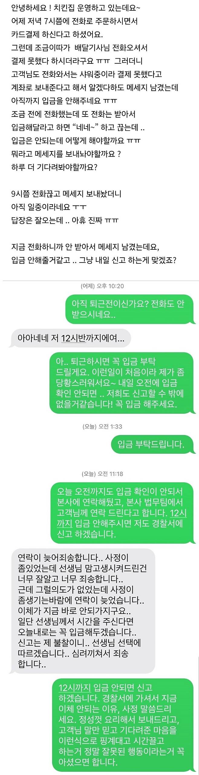 치킨을 배달했는데 입금을 안 하는 손님