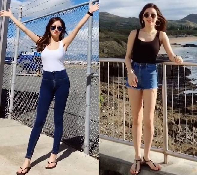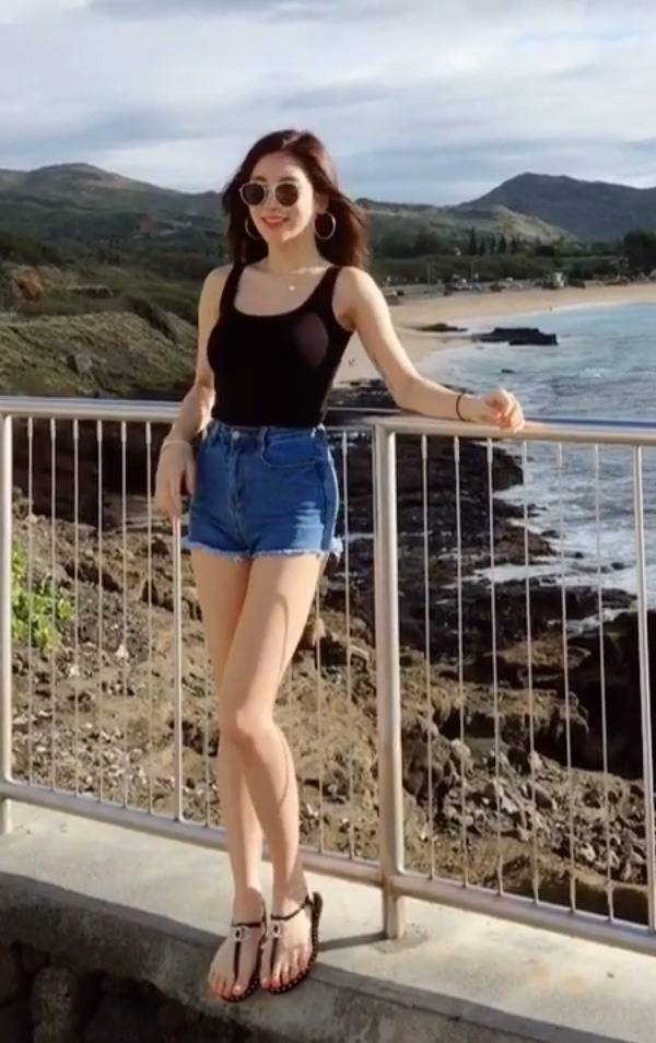 블랙 슬리브리스 톱과 하이웨이스트 데님 쇼츠를 매치해 건강미와 글래머러스한 실루엣을 강조했습니다.
