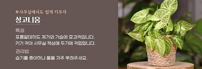 포름알데히드 제거와 습도 높이는데 효과적입니다. 키가 작아 사무실 책상에 두기에 적합합니다.