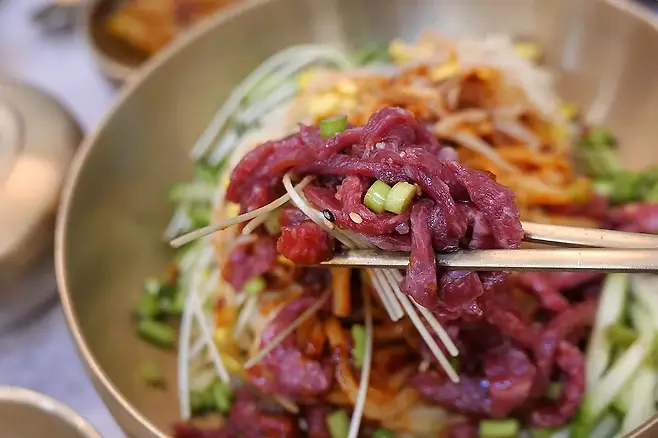 (사진 설명: 비주얼만으로 식욕을 돋우는 육회비빔국수 한 그릇)