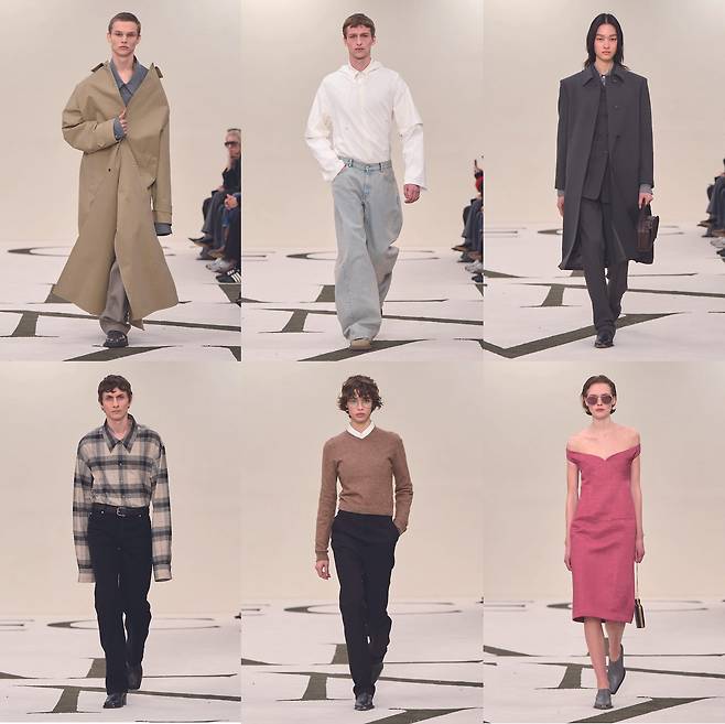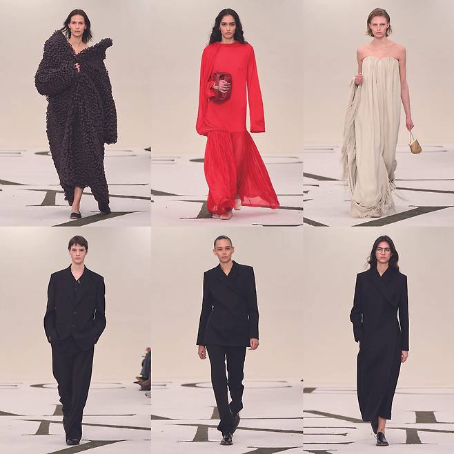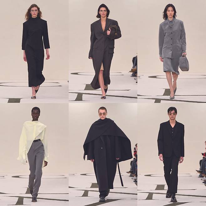 다채로운 소재를 동원한 것도 주목할만한데, 부드럽고 밀도 높은 울과 캐시미어부터 단단한 개버딘과 트윌, 매트한 몰스킨과 브러시드 코튼, 광택 있는 파유와 새틴까지 다양한 텍스처를 활용했다. 컬러 팔레트는 브랜드의 시그니처인 블랙, 그라나이트, 문그레이, 퍼지캐러멜, 오프화이트, 포슬린 등의 뉴트럴한 색조를 중심으로 하며, 바롤로 와인, 라즈베리, 페일한 감귤 등의 포인트 컬러도 놓치지 않았다.