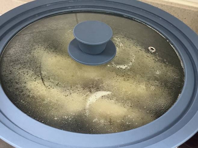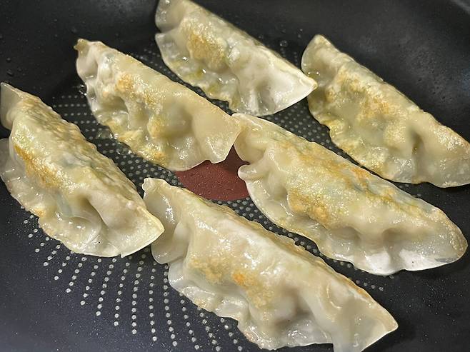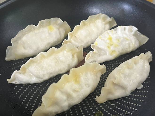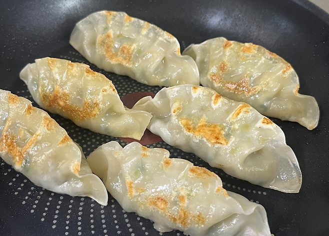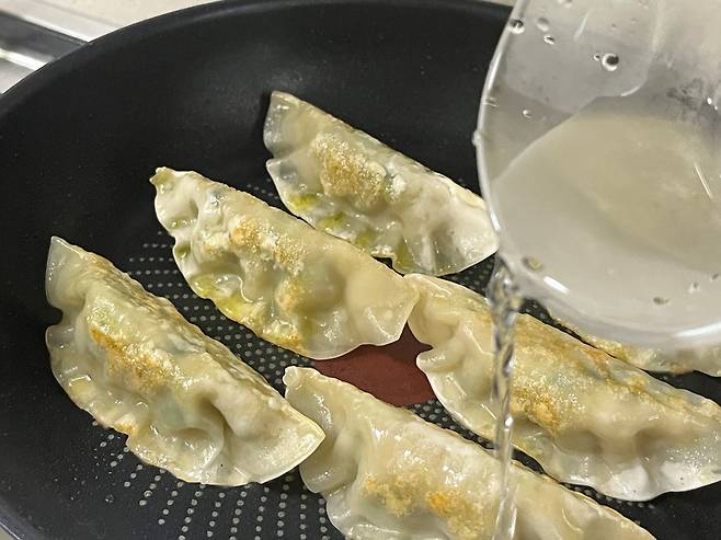 물을 많이 넣으면 만두가 필요 이상으로 축축해질 수 있기 때문에 만두 6~7개 기준으로 물은 딱 소주잔 1컵 정도만 넣으세요.