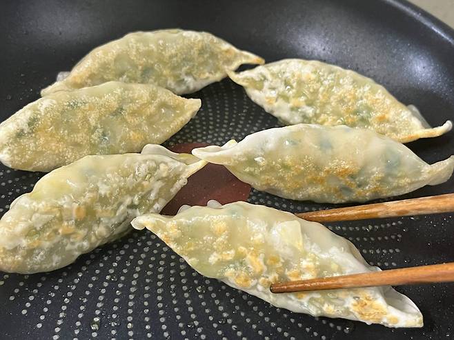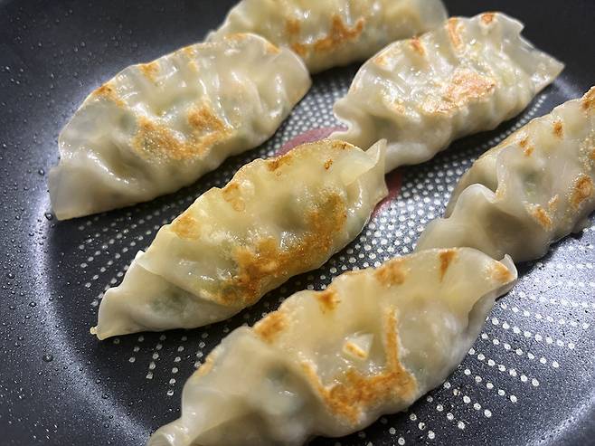 팬에 만두를 넣고 바닥면을 먼저 익혀 줍니다. 바닥면을 2분 정도 구워서 노릇하게 익혀 주세요. 만두는 한쪽 면만 익히는 것보다는 3면을 골고루 익히는 것이 중요합니다.