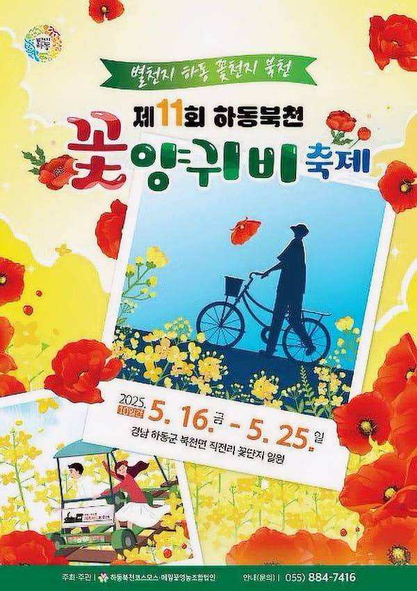 2025년 하동 북천 꽃양귀비 축제는 5월 16일부터 25일까지 10일간 개최됩니다. 축제 장소는 경상남도 하동군 북천면 경서대로 2253-9 일원이며, 주최는 북천 코스모스·메밀꽃 영농조합법인이 맡고 있습니다. 꽃밭 관람, 레일바이크, 공연, 체험 프로그램, 특산물 장터 등 다양한 콘텐츠가 준비되어 있어, 가족, 연인, 친구와 함께 방문하기에 좋은 봄 여행지로 추천할 만합니다.
