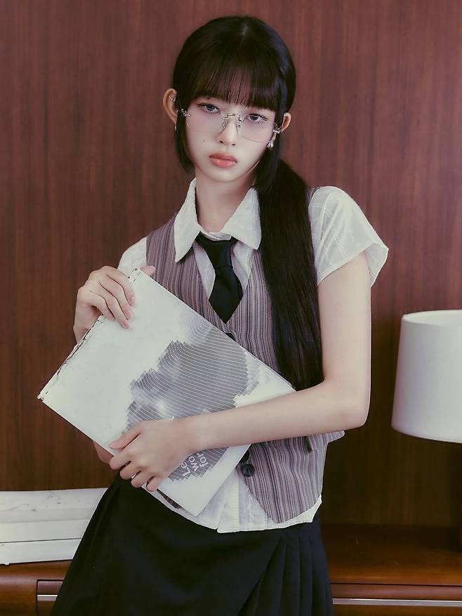 하얀 셔츠에 세로 스트라이프 베스트를 더한 룩은 깔끔하면서도 복고풍의 무드를 물씬 풍긴다. 특히 블랙 미니스커트와 타이 디테일이 더해지며, 하이틴과 프레피룩 사이의 감각적인 균형을 완성했다. 긴 머리는 정갈하게 묶어 깔끔함을 강조했고, 둥근 프레임 안경이 전체적인 룩의 키치한 포인트로 작용했다.