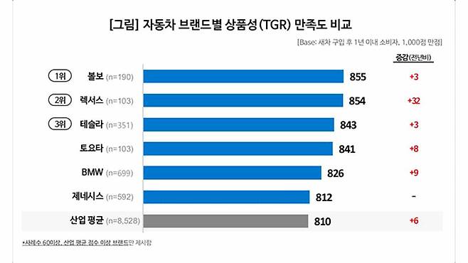 볼보와 불과 1점 차이인 854점을 기록한 렉서스는 올해 조사에서 가장 큰 상승세를 보였다.